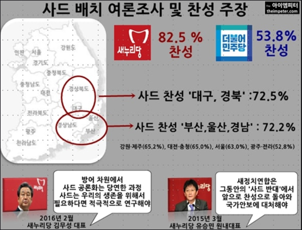 TK지역 주민들과 새누리당 의원들의 사드 배치 반대는 불과 몇 달 전에 보여준 의견과 전혀 달라 배신감마저 들 정도입니다. 지난 2월 연합뉴스와 KBS는 코리아리서치에 ‘사드 배치 여론조사’를 실시했습니다. (관련 기사:국민 67.1% ‘사드 배치’ 찬성…26.2% 반대)