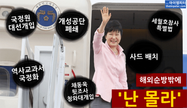 박근혜 대통령이 해외순방을 떠나기 직전이나 순방 중에는 국내에서 대형 사건 등이 터집니다. 러시아와 베트남 방문 때는 이석기 의원 구인이 프랑스와 영국 등 유럽을 방문하던 2013년 11월에는 통합진보당 정당 해산 심판 청구안과 전국공무원노조 압수수색이 벌어졌습니다. 중앙아시아 방문 때는 전교조 법외노조 판결이 벌어졌습니다.