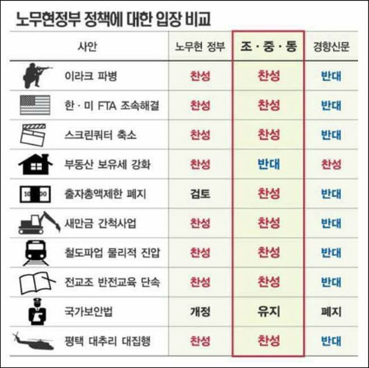 특히 노무현 정권 들어 한경오는 ‘시대적 불화’와 조우하게 됐다. 참여정부 시절 가없는 언론자유를 구가하였음에도 한경오는 정권과 갈등관계를 빚게 됐다. 한 예로 요 며칠 페북 등에 오르내리고 있는 ‘노무현 정부 정책에 대한 입장비교’라는 표가 그것이다. 표에는 경향신문 하나만 언급돼 있는데 사실은 한경오 셋 모두 비슷한 형국이다. 노무현 정권이 힘주어 추진했던 몇몇 사안, 즉 이라크 파병, 한미 FTA 체결, 스크린쿼터 축소, 새만금 간척사업, 평택 대추리 대집행, 대연정 등을 놓고 참여정부와 한경오 3형제는 갈등을 빚었다. 지금에 와서 결과를 두고 보자면 참여정부의 판단이 옳았던 것도 있고, 그 반대의 경우도 있다. 그러나 당시 상황에서 한경오 3형제는 적어도 진보적 가치, 공동체적 가치에서 볼 때 반대 입장에 설 수밖에 없었다고 생각되는 측면이 많았다고 본다. 이는 비단 한경오 뿐만이 아니라 범 진보진영, 심지어 노사모 일각에서도 동조했던 사안이었다.