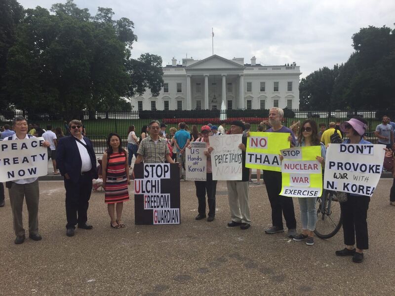 워싱턴 디씨도 어제(월,8/14) 낮 12시에 백악관 앞에 모여 집회시위를 개최 하였다 합니다. 특히, 미국인 평화운동 단체들 대부분이 DC 부근의 버지니아 샬러츠빌 시위참사 현장으로 가 있어서 시위 조직에 다소 어려움이 있었다 합니다. 그러나 트럼프의 북침전쟁 기도라는 사안의 중대성이 있기에 참여 가능한 활동가들끼리라도 모여 연대시위의 의의를 살리며 시위를 하기로 하였다 합니다. 참여자 중에는 국내에도 잘 알려진 탐사보도 전문 저널리스트 팀쇼락 기자도 취재 겸 동참 하였다 합니다.