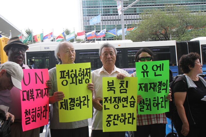뉴욕의 경우, 낮 12시에 유엔본부를 마주보는 건너편 길에서 재미동포 진보단체 활동가 20여명과 미국인 진보평화운동단체들의 활동가 60명 가량이 모여 우리말과 영어 구호(1. 북침전쟁 책동하는 트럼프정부 규탄한다 2. 북침 전쟁책동 북침 전쟁연습 당장 중단하라 3. 불의한 유엔 대북제재 당장 철회하라 4. 적대정책 중단하고 평화협정 체결하라1. Stop the war provocations, No military exercise! 2. Stop the war games! Peace talks now! 3. Stop UN sanctions against North Korea! 4. End Korean War! Peace Treaty Now!)로 시위를 시작하였습니다. 시위를 시작한 후 먼저 공동성명서를 우리말과 영어로 각각 재미동포 활동가와 미국위 활동가 각각 낭독하는 순서를 가졌습니다. 그리고 참가 단체의 몇 대표들과 참가자 중에 자유로이 몇 분이 나와 이번 이슈에 대한 발언을 하였으며 중간 중간 구호를 함께 하였고 할머니활동가단체의 세 분이 나오셔서 집회 마무리의 노래를 경쾌하게 해 주시면서 한 시간의 시위를 마쳤습니다.