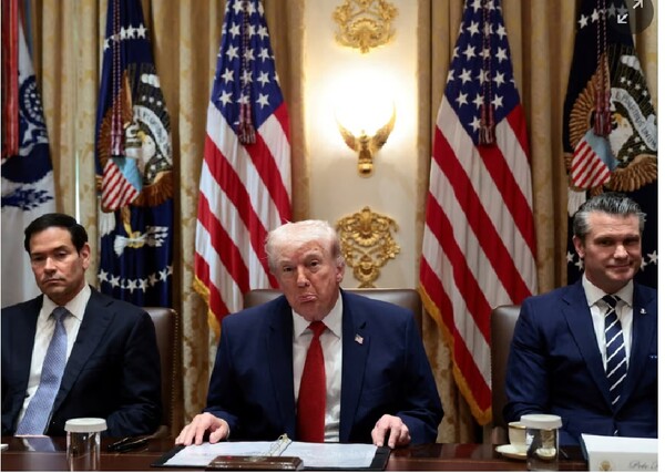 "나는 절박함과는 정반대다": 트럼프 대통령은 지난 26일 미국이 함정에 빠졌다는 지적에 반박하면서 절박한 쪽은 이란이라고 주장했다. 왼쪽은 마르코 루비오 국무장관, 오른쪽은 피트 헤그세스 국방장관. 로이터 가디언 3월 27일