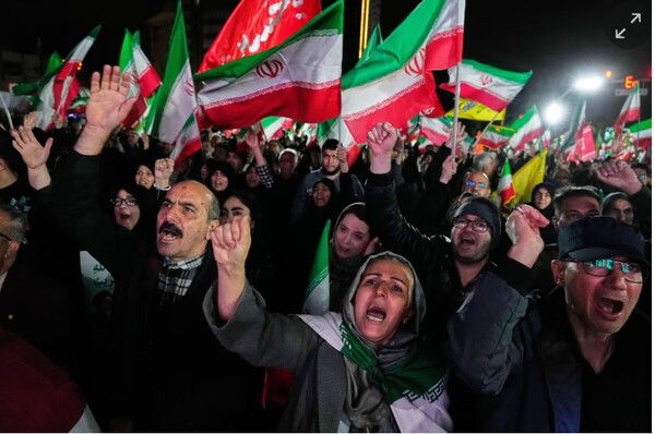 지난 3월 25일 이란 수도 테헤란에서 열린 집회에서 이란 정권 지지자들이 구호를 외치고 있다. AP 가디언 3월 27일