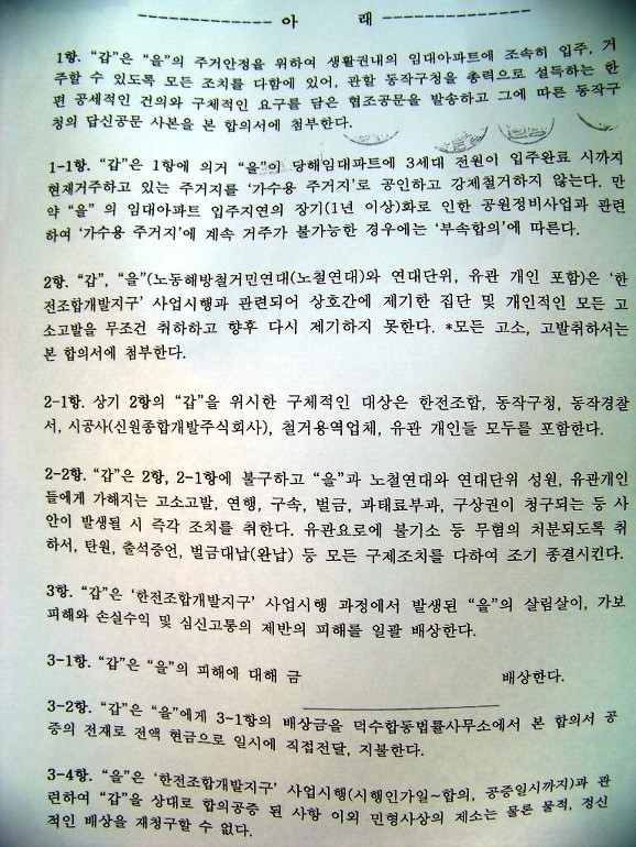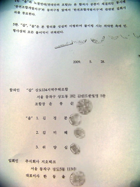 줄기찬 세대위의 투쟁에 동작구청과 한전상도연합 주택조합은 2009년 5월 27일 재개발 세입자에 대한 주거권 대책에 적극 노력한다는 문서합의를 하였다.