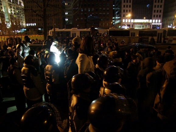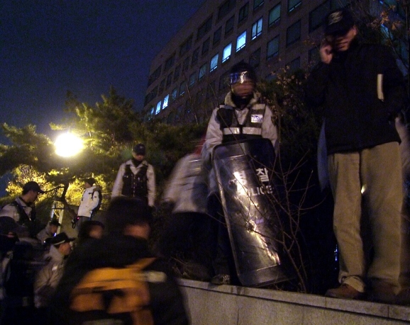 그러나 당초 청계광장 원천봉쇄를 했던 시경인 만큼, 행진도 잠시 허하는듯하다가 가로막아 행진이 순탄치가 않았고, 오후 7시경 명동 앞에서 행진이 멈추었습니다. 이에 유가족 및 이를 뒤따르던 3천여명은 오후 7시경 명동 앞(소공동 롯데백화점) 왕복 8차선 도로 가운데 종로 방향 4차선 도로를 점거.연좌하여 약 3시간 가량 경찰과 대치했습니다. 이읒고 강제 해산에 나선 경찰에 의해 참가자들 대부분 10시경 인도로 밀려났고, 이 과정에서 크고 작은 물리적 충돌이 발생됐으며, 5명이 연행되고 1명은 다쳐 119구급대에 의해 병원으로 실려갔습니다.