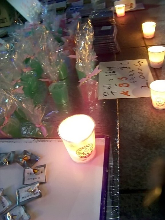 △ 한편 조계사비대위 자원봉사자들은 청계 주변에서 오후부터 밤늦게까지 촛불바자회를 진행했다.
