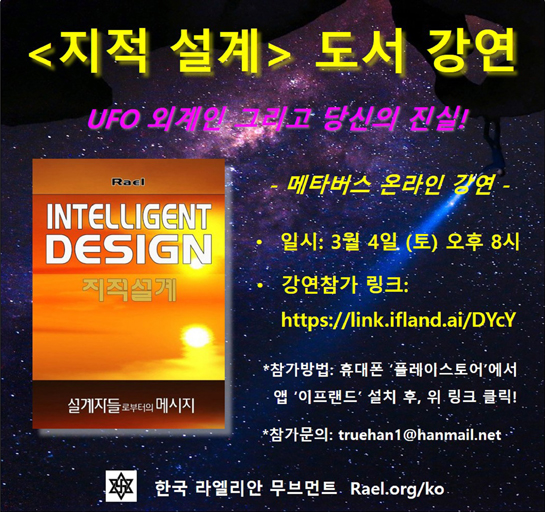 인류를 비롯한 지구 상의 모든 생명은 우주인(ET)‘엘로힘(Elohim : 고대 히브리어로“하늘에서 온 사람들”이란 뜻)’이란 고도의 외계문명에 의해 과학적으로 창조됐다고 제시하는 한국 라엘리안 무브먼트(대표 오승준)가 오는 3월 4일(토) 오후 8시부터 9시 30분까지 1시간 30분 동안‘지적 설계’도서(도서출판 메신저 간행)를 통해 우주인의 메시지를 소개하는 온라인(메타버스) 대중강연회를 개최한다.