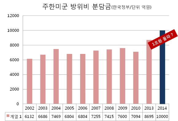 방위비분담금 협정은 1991년부터 시작됐다. 2009년 1월 체결된 제8차 협정이 가장 최근이다. 첫해 1073억원이었던 분담금 규모가 노무현 정권 때인 2005년과 2006년을 제외하고 20년 동안 계속 늘어나 현재 8695억원(2013년)에 달한다. 주한미군 1인 2600만원을 지원하는 셈으로 2001년(1300만원)보다 2배나 많아졌다. 국방비 대비 방위비분담금 점유율도 그간 2배 늘어나 2.78%를 차지한다. 미국 측의 계속되는 인상요구로 내년에는 1조원을 넘어설 전망이다.