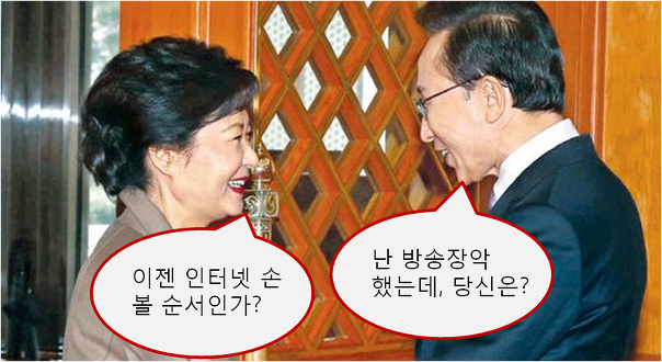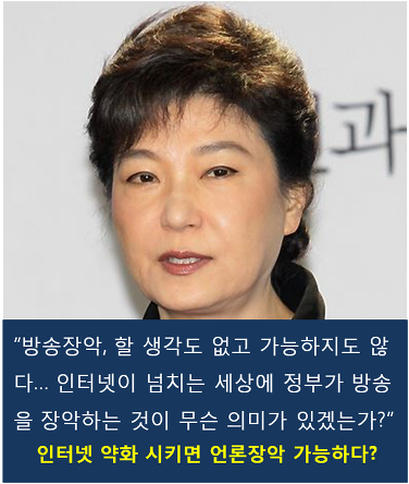 이 발언을 곱씹어 볼 필요가 있다. 상당한 수준까지 도달한 것으로 평가받은 ‘MB의 방송장악’이 박 대통령의 눈에는 미흡한 수준으로 비쳐지는가 보다. 인터넷에 대한 언급이 찝찝한 여운을 남긴다. 인터넷 때문에 완벽한 수준의 방송과 언론장악이 어렵다는 얘기로 들리기 때문이다.