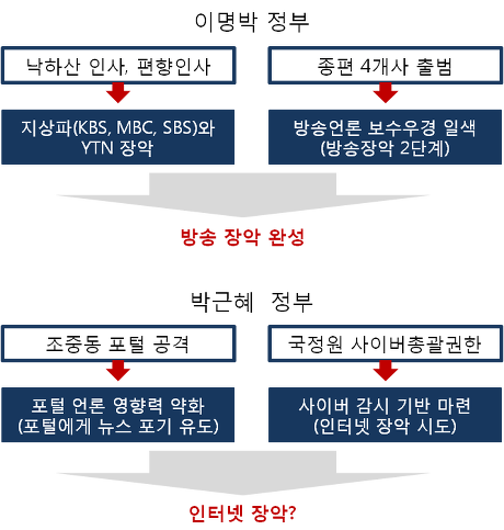MB정부는 지상파 방송에 자신의 하수인들을 사장으로 앉히는 방식으로 기존 방송을 장악한 뒤 보수일색의 종편 4개사를 출범시켜 방송언론을 동일한 컬러로 도색했다. 채널은 많아도 진보적 성향의 방송은 한곳도 없다. MB의 방송장악이 완성된 것이다.