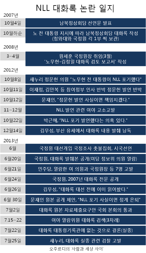 NLL논란은 국정원과 인연이 깊다. 여야 정쟁의 핵심으로 부상하게 된 계기도 국정원 댓글사건이었고, 대화록 발체본과 전문을 공개해 ‘NLL 정국’을 만든 장본인도 국정원장이다.