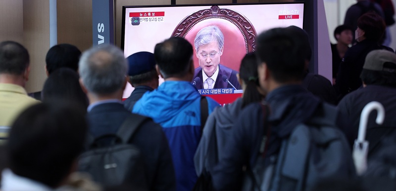 시민들이 1일 오후 서울역 대합실에서 이재명 더불어민주당 대통령 후보의 공직선거법 위반 혐의 대법원 선고 생중계 영상을 시청하고 있다. 대법원은 이날 이 후보의 공직선거법 위반 사건에 대해 유죄 취지로 파기환송했다. 2025.5.1 ⓒ뉴스1 “ 남소연 기자 ” 응원하기