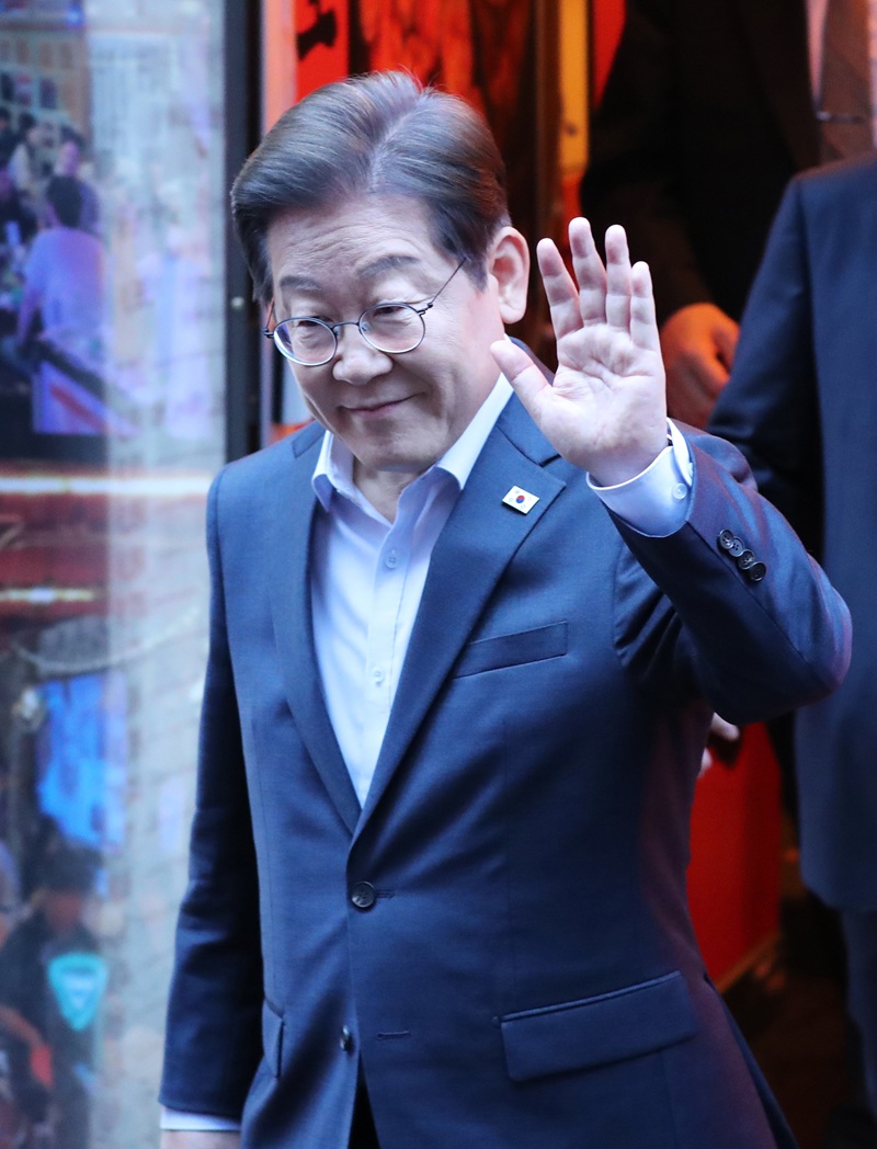 이재명 더불어민주당 대통령 후보가 1일 서울 종로구의 한 포차 식당에서 '당신의 하루를 만드는, 보이지 않는 영웅들'이란 주제로 열린 배달 라이더, 택배 기사 등 비(非)전형 노동자들과 간담회를 마친 뒤 나서며 손인사를 하고 있다. (공동취재) 2025.5.1 ⓒ뉴스1