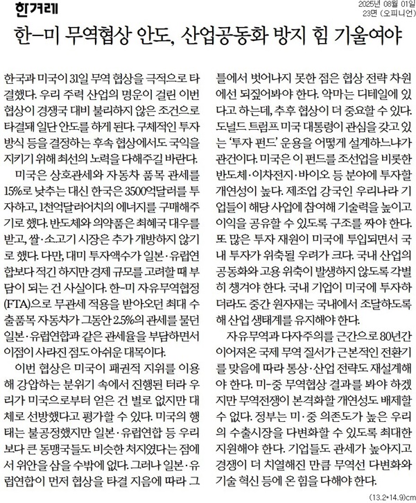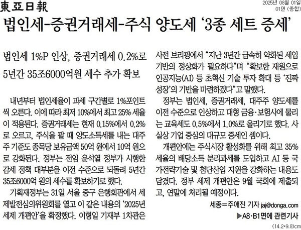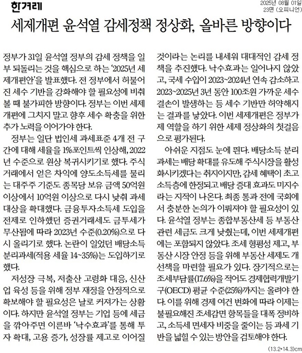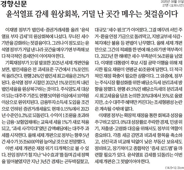 경향신문은 <윤석열표 감세 원상회복, 거덜 난 곳간 메우는 첫걸음이다> 사설에서 “이재명 정부는 확장적 재정을 통한 회복과 성장을 추구하고 있다. 0%대 성장률로 추락한 경제, 민생 위기, 저출생·고령화 대응을 위해서도 정부의 역할이 중요하다. 각종 세금 감면과 비과세 항목을 축소하고, 선진국과 비교해 턱없이 낮은 부동산 보유세도 정비하고, 장기적이고 종합적인 ‘증세 로드맵’을 마련할 필요가 있다. 윤석열표 감세를 되돌리는 이번 세제 개편은 그 첫발이어야 한다”라고 주장했다.