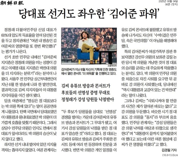 조선일보는 “정 대표는 김씨의 유튜브 방송과 김씨가 주최한 콘서트 등에 여러 번 등장하며 친분을 과시했다. 반면 박 의원은 개인 일정을 이유로 김씨 콘서트에 불참했고 유튜브 방송에 나가서도 자신이 ‘수박(겉은 민주당, 속은 국민의힘)’이 아님을 해명해야 했다”고 했다. 그러면서 “특히 김어준씨가 여성가족부 장관 후보자였던 강선우 의원의 보좌관 갑질 논란 당시 박 의원을 겨냥한 것이 정 대표의 승리를 굳히는 데 주요하게 작용했다는 분석도 있다”고 했다.