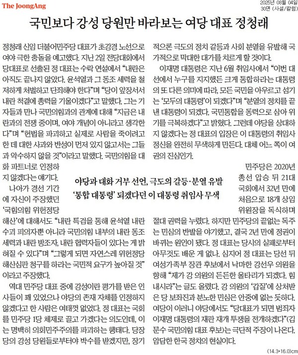 중앙일보는 <국민보다 강성 당원만 바라보는 여당 대표 정청래> 사설에서 “역대 민주당 대표 중에 강성이란 평가를 받은 인사들이 꽤 있었으나 야당의 존재 자체를 인정하지 않겠다고 한 사람은 여태껏 없었다”며 “정 대표는 국회를 민주당 1당 체제로 끌고 가겠다는 의도인데, 이는 명백히 의회민주주의를 파괴하는 행태”라고 했다. 이어 “당장 당의 강성 당원들로부터야 박수를 받겠지만, 장기적으론 극도의 정치 갈등과 사회 분열을 유발해 국가적으로 막대한 대가를 치르게 할 것”이라고 했다.