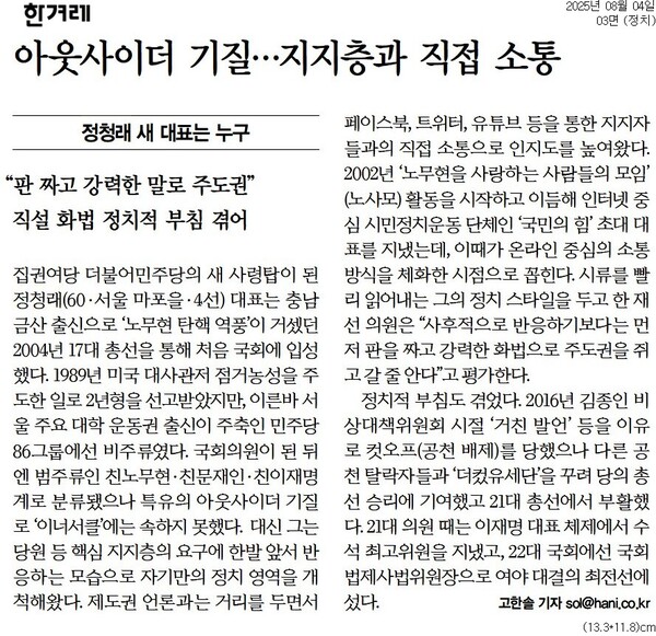 다수 신문이 정 대표가 야당과 각을 세웠다는 점에 주목했다. 4일자 중앙일보 1면 제목은 <민주 새 대표 정청래 야당 향해 선전포고>이고, 동아일보 1면 제목은 <與대표 정청래 “내란당 사과없인 악수 안해”>이다. 한국일보 1면도 <“내란 사과 없이 악수 없다” 초강성 여당시대>이다.