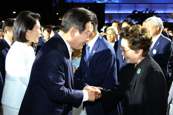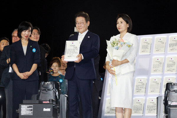 15일 오후 8시 서울 광화문 광장에서 열린 국민임명식 '광복 80년, 국민 주권으로 미래를 세우다'에서 이재명 대통령이 국민들에게 감격어린 감사인사를 전했다. 이 대통령은 이날 취임 72일 만에 제21대 대통령 국민임명식에 참석했다. 국민대표 80인, 특별초청 국민, 국가 주요인사, 각계 대표, 일반시민 등 약 1만 명이 참석했다. 애초 7월 17일 제헌절에 임명식을 열 예정이었지만, 전국적 호우 피해가 극심해 이날로 미뤘다.