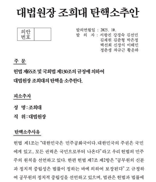 서 원내대표는 "이처럼 피소추자의 중대한 헌법 위반과 국민의 신뢰에 대한 배반은 우리 헌법의 민주주의 원칙을 정면으로 위배한 것으로서 사법부 수장으로서의 책임을 면할 수 없으므로 조국혁신당은 조희대 대법원장의 탄핵을 소추한다"며 "국민의 신뢰를 잃은 사법부는 독립이 아니라 고립의 길을 가고 있다. 국민의 심판으로 사법의 미래를 새로 쓰겠다"고 다짐했다.