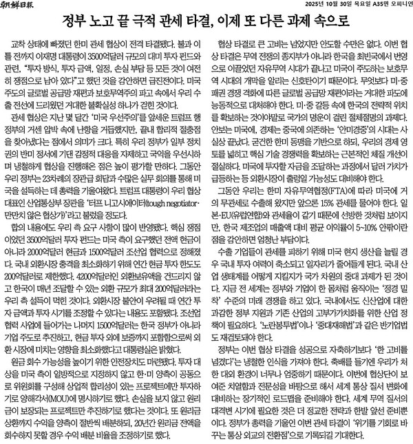 조선일보 <관세협상 타결… 年 200억불씩 2000억불 현금투자>