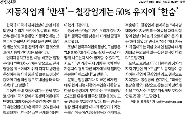 경향신문은 3면 <자동차업계 ‘반색’… 철강업계는 50% 유지에 ‘한숨’> 보도에서 “산업계 표정이 엇갈리고 있다. 25% 관세를 적용받던 자동차업계는 15%로 인하되면서 한숨을 돌린 반면, 철강업계는 50% 고율 관세가 유지될 것으로 보여 시름이 깊어지는 모습”이라며 “도널드 트럼프 미국 대통령의 정치적 지지 기반인 러스트벨트 노동자들이 종사하는 산업이 철강업인 것도 원인으로 지목된다”고 했다.