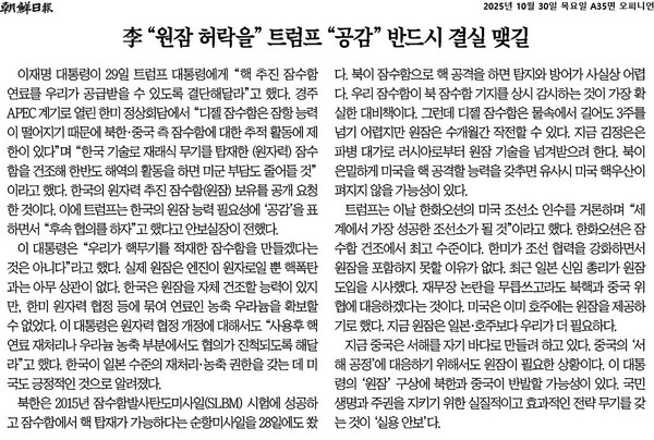 이에 대해 조선일보는 환영의 뜻을 표했다. 조선일보는 사설 <李 “원잠 허락을” 트럼프 “공감” 반드시 결실 맺길>에서 “한국은 원잠을 자체 건조할 능력이 있지만, 한미 원자력 협정 등에 묶여 연료인 농축 우라늄을 확보할 수 없었다”며 “북이 잠수함으로 핵 공격을 하면 탐지와 방어가 사실상 어렵다. 우리 잠수함이 북 잠수함 기지를 상시 감시하는 것이 가장 확실한 대비책이다. 그런데 디젤 잠수함은 물속에서 길어도 3주를 넘기 어렵지만 원잠은 수개월간 작전할 수 있다”고 했다.