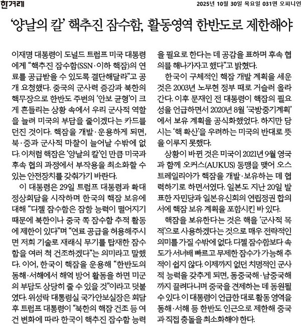 반면 한겨레는 원자력 추진 잠수함을 ‘양날의 칼’로 묘사했다. 군비 경쟁으로 이어져 대북, 대중 관계에 해가 될 가능성도 있다는 것이다. 한겨레는 <양날의 칼’ 핵추진 잠수함, 활동영역 한반도로 제한해야> 사설에서 “중국의 군사력 증강과 북한의 핵무장으로 한반도 주변의 ‘안보 균형’이 크게 흔들리는 상황 속에서 우리 군사적 역할을 늘려 미국의 부담을 줄이겠다는 카드를 던진 것”이라며 “핵잠을 개발·운용하게 되면, 북·중과 군사적 마찰이 늘어날 수밖에 없다”고 우려했다. 한겨레는 “이제까지 없던 치명적인 군사적 능력을 갖추게 되면, 동중국해·남중국해까지 끌려다니며 중국을 견제하는 데 동원될 수 있다. 이 대통령이 언급한 대로 활동 영역을 동해·서해 등 한반도 인근으로 제한해 중국과 직접 충돌을 최소화해야 한다”고 했다.