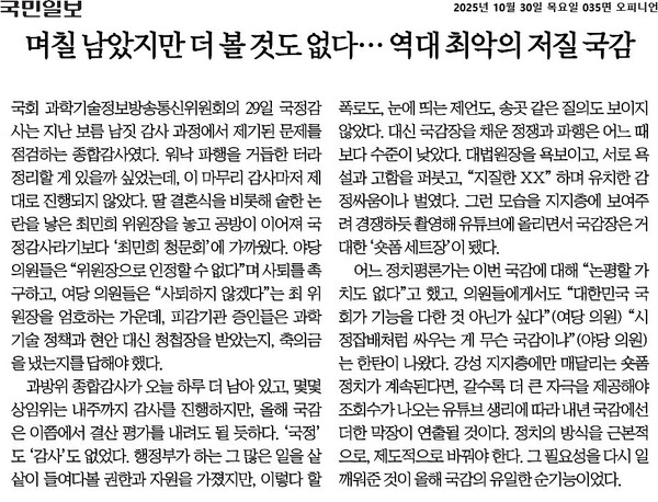 이에 대해 국민일보는 사설 <며칠 남았지만 더 볼 것도 없다… 역대 최악의 저질 국감>에서 “(과방위 국정감사는) 딸 결혼식을 비롯해 숱한 논란을 낳은 최민희 위원장을 놓고 공방이 이어져 ‘최민희 청문회’에 가까웠다”며 “‘국정’도 ‘감사’도 없었다. 행정부가 하는 그 많은 일을 샅샅이 들여다볼 권한과 자원을 가졌지만, 이렇다 할 폭로도, 눈에 띄는 제언도, 송곳 같은 질의도 보이지 않았다”고 했다.