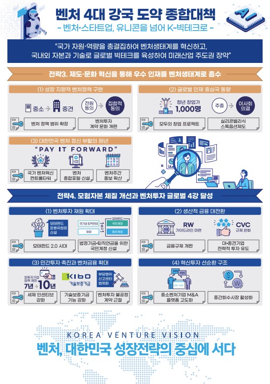 금융 규제를 벤처출자 친화적으로 개편해 민간 자본 참여를 확대한다. 예를 들어 은행에는 정책펀드 출자 시 위험가중치 적용 가이드라인을 마련하고, 증권사는 대형 투자은행(IB)을 중심으로 비상장 벤처투자를 포함한 모험자본의 의무공급을 추진한다.