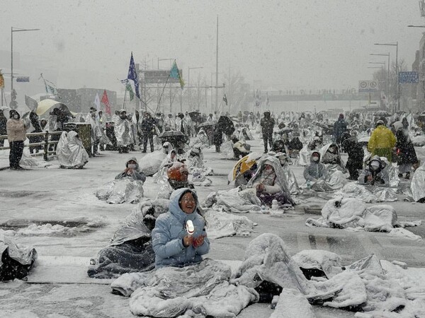 2025년 1월 5일 밤새 눈을 맞으면서도 서울 한남동 대통령 관저 인근에서 내란수괴 윤석열 체포를 요구하며 농성을 벌인 시민들 모습. 2025. 01. 05 [출처. 강경희님 페이스북]
