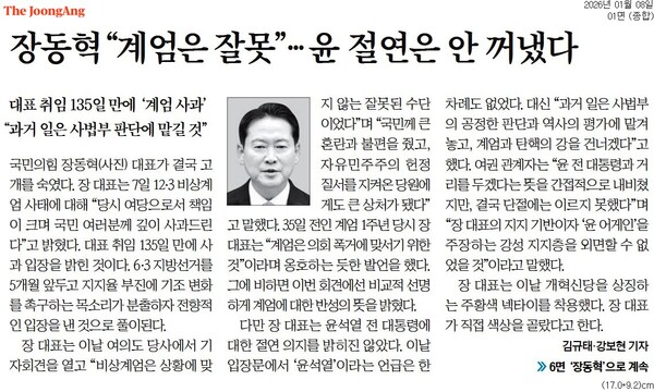 중앙일보 : 장동혁 “계엄은 잘못” 윤 절연은 안 꺼냈다