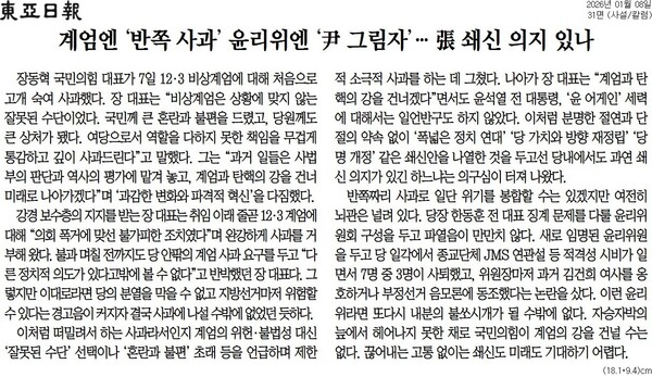 한국일보 : 장동혁, 뒤늦은 계엄 사과… ‘윤 절연’은 없었다