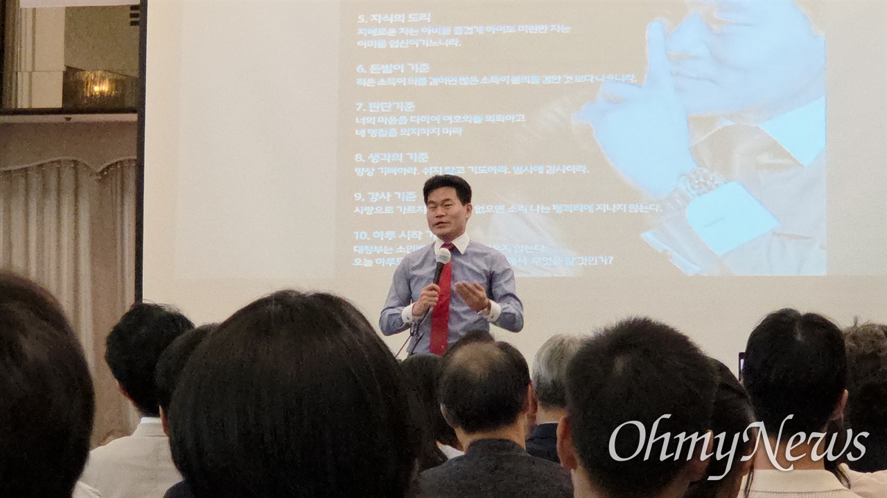 2025년 6월 25일 서울 종로구에 위치한 한국프레스센터에서 진행된 '한국 청년 지도자 아카데미' 발대식 현장 모습. 전한길씨가 연단에 나섰다. ⓒ 오마이뉴스
