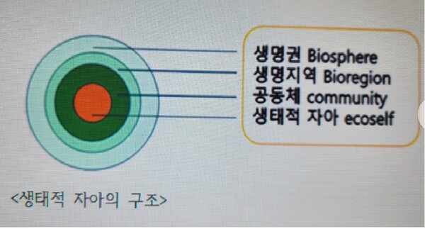 이래 가지고는 세상이 좋아질 리가 없다. 힘없고 가난한 나라는 영원히 그 굴레를 벗어날 수 없고, 부자 나라는 기득권을 유지하기 위해 끊임없이 세상을 갈궈댈 것이다. ‘나’를 규정하는 프레임을 바꿔야 한다. 기존의 사회학적 관점 대신 생태학적 관점으로 ‘나’를 규정해 보자. 나를 둘러싼 동심원의 중심에 생태적 자아가 있고 순차적으로 공동체, 생명지역, 생명권으로 자아가 확장된다.
