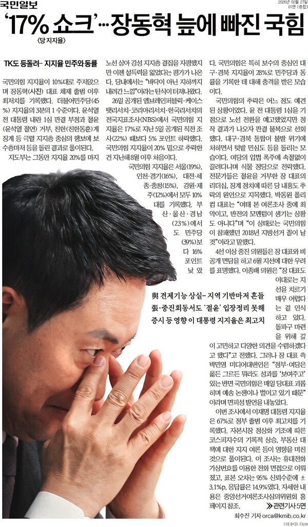 조선일보도 <‘법 왜곡죄’ 끝내 강행, 견제해야 할 국힘 지지율은 17%> 사설에서 국민의힘의 지지율 추락을 두고 “장동혁 대표가 ‘윤석열 무죄 추정’ ‘윤과 절연을 요구하는 세력과 절연’을 선언한 여파일 것“이라고 했다.