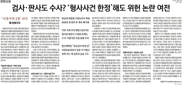 ‘법 왜곡죄’에 대해선 진보 성향으로 분류되는 경향신문과 한겨레에서도 우려가 나온다. 경향신문은 27일자 6면 <검사·판사도 수사? ‘형사사건 한정’해도 위헌 논란 여전> 기사에서 “(사법개혁) 3법 중에서도 가장 위헌적 요소가 많다고 지적받아왔다. 민주당은 전날 급하게 법안을 일부 수정해 이런 논란을 없애려 했지만, 법조계 안팎에서는 비판이 여전하다”며 “정부와 국회가 공정하고 평등해야 할 사법부와 수사기관을 정치적으로 압박해 독립성을 침해한다는 지적”이라고 했다.