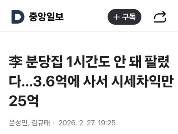 이재명 대통령은 27일 자신이 30년 가까이 실거주하던 아파트의 매각 소식을 보도하며 '시세차익 25억 원'을 부각시킨 중앙일보의 기사를 두고 "왜 이렇게 악의적인가" "개 눈에는 뭐만 보인다는 말이 있다" 등 이례적일 정도로 강한 표현을 동원해 직설적으로 비판했다. 부동산 시장 정상화를 위한 총력전의 일환으로 주거용 1주택까지 내놓는 결단을 내렸음에도 언론의 왜곡 보도로 인해 시장에 잘못된 신호가 전해질까 우려했던 것으로 보인다.
