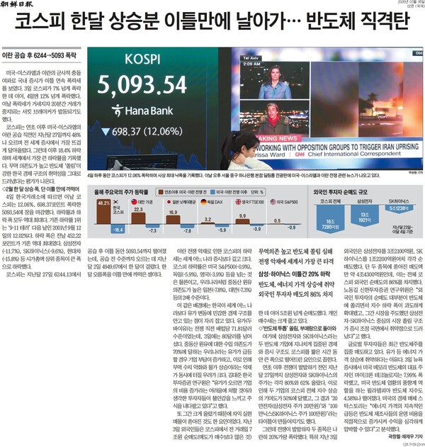 조선일보는 2면 기사에서 “코스피는 연초 이후 미국·이스라엘의 이란 공습 직전인 지난달 27일까지 48%나 오르며 전 세계 증시에서 가장 뜨겁게 달아올랐다”며 “그런데 이후 18.4% 하락하며 세계에서 가장 큰 하락률을 기록했다. 무역 의존도가 높고 반도체 ‘쏠림’이 강한 한국 경제 구조의 취약성을 그대로 드러냈다는 평가가 나온다”고 분석했다. “한 달 오름폭을 이틀 만에 까먹은 셈”이라고도 했다.