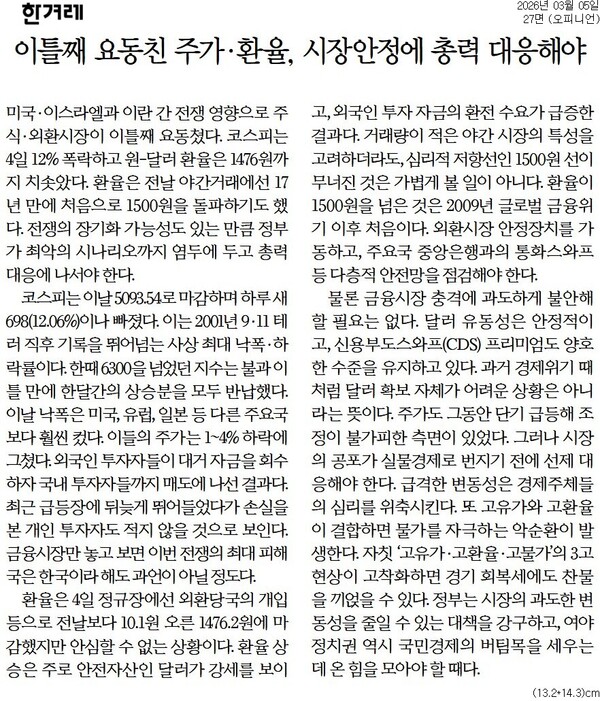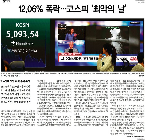미국과 이란 전쟁 파장으로 4일 서울 증시가 크게 하락한 가운데, 조선일보를 제외한 주요 일간지들이 1면에서 해당 이슈를 다뤘다. 4일 코스피 지수는 12.06%, 코스닥 지수는 14.0% 하락했는데 두 시장 모두 하락 폭이 역대 최대였다. 이날 코스피와 코스닥 두 시장에서 주가 급락으로 매도 사이드카가 발동되고 서킷 브레이커까지 차례로 발동됐다. 서킷 브레이커는 모든 종목의 매매를 20분간 중단하는 것으로 코스피와 코스닥 시장 모두 1년 7개월 만에 발동됐다. 주요 일간지들은 이같은 급락을 2001년 9월11일 테러 다음날 12.02%가 떨어졌을 때와 비교하면서 이를 뛰어 넘는 역대 최대 하락률이라고 보도했다. 원·달러 환율도 글로벌 금융위기 이후 17년 만에 야간거래에서 장중 한때 1500원을 웃돌았다.