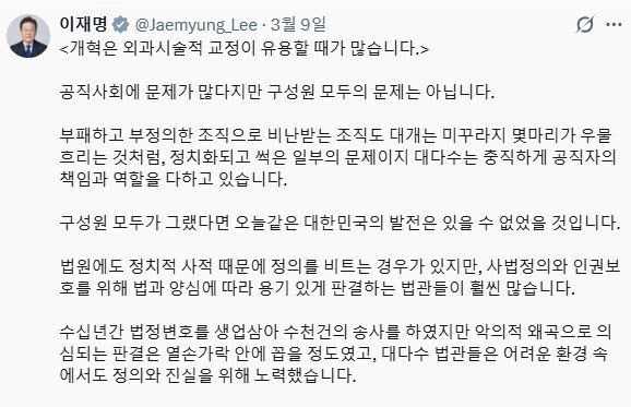 이어 "이는 곧 이재명 정부가 제안한 개혁 방향을 존중한다는 전제에서 이루어진 판단이다. 정성호 장관이 밝힌 것처럼 이번 정부안에는 이미 중요한 변화들이 담겨있다"면서 "검찰의 직접 수사개시권과 인지수사권을 폐지했고, 검찰을 중수청과 공소청으로 분리하는 구조를 제시했다. 또한 검사의 파면이 가능한 징계 제도, 정치관여죄 신설, 법왜곡죄 도입 등 검찰권 남용을 견제할 장치도 포함돼 있다"고 정성호 법무장관을 적극 옹호했다.