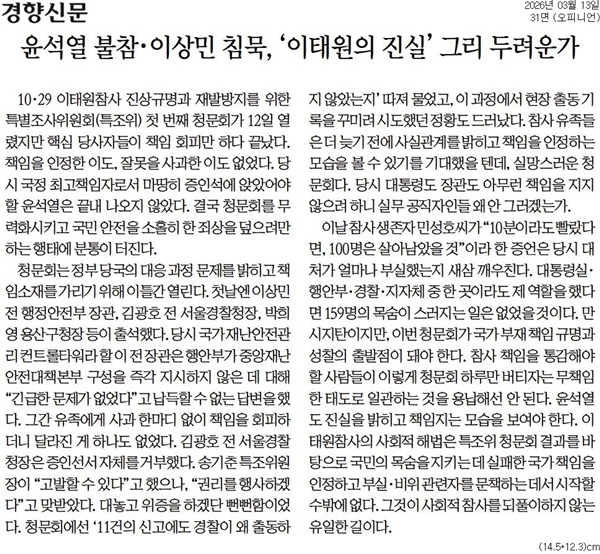 한겨레 역시 사설을 내고 “진실 규명을 바라는 민심을 거스르는 이들의 무책임한 행태가 개탄스럽다”고 비판했다. 한겨레는 윤 전 대통령의 불참과 김 전 청장의 선서 거부를 두고도 “국가 시스템의 붕괴를 소명해야 할 책임자들이 개인의 방어권 뒤로 숨어 유족의 가슴에 다시 대못을 박은 셈”이라고 규탄했다.