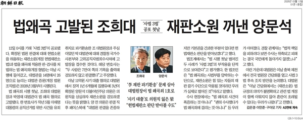 중앙일보 역시 1면 머리기사에서 사법개혁 3법 시행 첫날 혼란이 현실화됐다고 지적했다. 중앙일보는 “향후 경찰이나 공수처가 이 변호사 주장을 받아들여 조 대법원장을 정식 입건하면 사법부는 극심한 혼란을 겪을 전망”이라며 “경찰과 검찰의 처분, 법원의 판단이 재차 법왜곡죄 고발 대상이 돼 조 대법원장 대상 수사·재판이 무한 반복되는 현상도 벌어질 수 있다”고 했다.