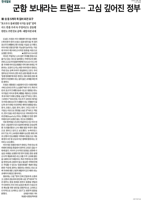 도널드 트럼프 미국 대통령이 한국·중국·프랑스·일본·영국이 호르무즈해협에 군함을 보내야 한다고 밝히면서 사실상 파병을 요구했다. 미국과 이스라엘의 침공으로 시작된 이란 전쟁에 동맹국을 비롯한 다른 나라들을 끌어들이려는 전략이란 지적이 나온다. 16일 아침신문들은 한국의 군사 개입 시 벌어질 상황에 우려를 표하며 한국 정부의 ‘외교력’을 주문했다. 경향신문과 한겨레는 파병에 반대하는 입장을 사설로 밝혔다.