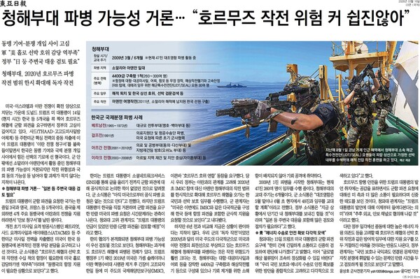 동아일보는 또 청해부대가 호르무즈해협에 파병됐던 6년 전과 비교해 “지금은 상황이 판이하다”며 “우리 군의 ‘독자 작전’이었던 2020년과 달리 미국 주도의 다국적군으로 미국과 이란 전쟁의 최전선으로 부상하고 있는 호르무즈 해협에 청해부대를 파병하는 것은 작전 위험도가 훨씬 크다”고 했다. “청해부대는 대함·대공미사일과 어뢰 등을 장착한 4400t급 구축함과 해상작전헬기 등으로 구성돼 있으나 기뢰 제거를 위한 소해함이 배치되지 않아 기뢰 공격에 취약하다”는 것이다.