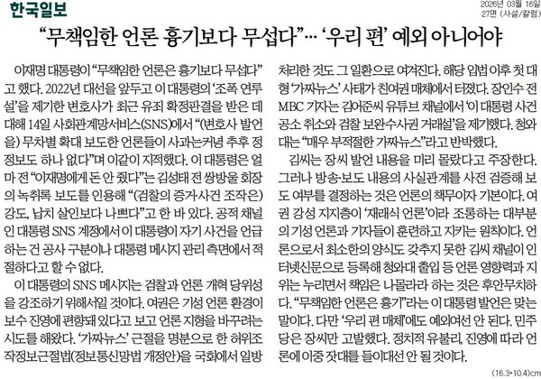 한국일보는 사설 <“무책임한 언론 흉기보다 무섭다”...‘우리 편’ 예외 아니어야>에서 “공적 채널인 대통령 SNS 계정에서 이 대통령이 자기 사건을 언급하는 건 공사 구분이나 대통령 메시지 관리 측면에서 적절하다고 할 수 없다”고 했다.