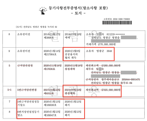 문제는 타이밍이다. 토지 매입 시점은 정O진 씨가 말레이시아로 도피하기 직전이다. 영광군이 브로커의 배우자 명의 토지를 시가 이상으로 매입해 주고, 브로커가 해외로 도피한 구도다. 이 토지 매입 대금이 해외 도피 자금으로 사용됐을 가능성도 배제할 수 없다.