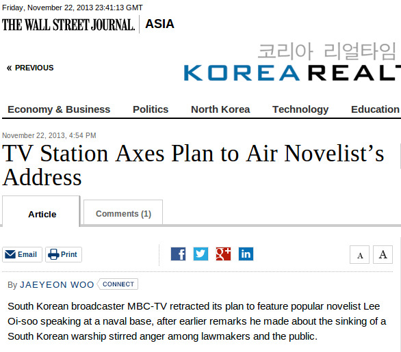 한국 방송 MBC TV는 유명한 소설가 이외수씨가 한국 전투함이 침몰한 사건에 관해 과거에 했던 발언을 이유로 국회의원들과 대중이 분노하자 이씨가 해군 부대에서 행한 연설 방영 계획을 철회했다.