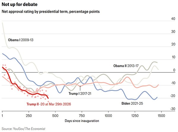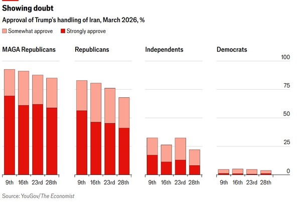 트럼프 대통령의 인기는 빨간 모자를 쓰는 친트럼프 충성파 MAGA(미국을 다시 위대하게!)세력을 빼고는 원래부터 높지 않았다. 이코노미스트에 따르면, 트럼프의 1, 2기 임기 동안 지지율이 반대율보다 높았던 주가 8주에 지나지 않았다. 원래 그랬다지만, 이란 침공 이후의 최근 수치는 11월 중간선거를 앞둔 트럼프 대통령과 공화당 모두가 심각하게 걱정해야 할 정도로 더 좋지 않다.