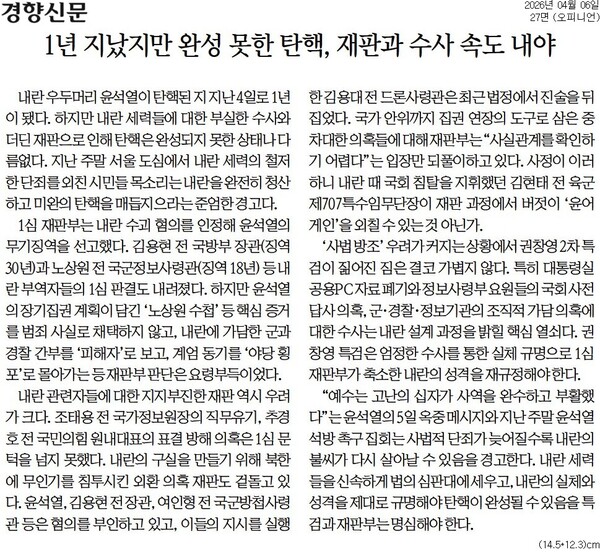 이날 사설에서도 ‘전쟁 추경안’과 관련해 다음과 같은 사설이 실렸다.