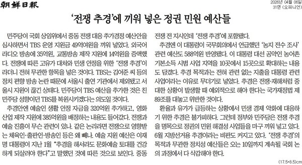 조선일보는 이날 사설 <‘전쟁 추경’에 끼워 넣은 정권 민원 예산들>에서 “민주당이 국회 상임위에서 중동 전쟁 대응 추가경정 예산안을 심사하면서 TBS 운영 지원금 49억여원을 끼워 넣었다. 외국어 라디오 방송에 35억원, 교통방송 제작 지원에 14억원을 증액했다. 전쟁에 따른 고유가 대처와 민생 안정을 위한 ‘전쟁 추경’이라더니 전혀 무관한 항목을 넣은 것”이라며 “TBS는 김어준 씨 등의 정치 편향 방송 논란 때문에 서울시 출연 기관에서 제외됐고 서울시 지원이 끊긴 상태다. 민주당이 TBS 예산을 추가한 것은 친민주당 성향이던 TBS를 복원시키겠다는 의도일 것”이라 전했다. 조선일보는 “6월 지방선거용 추경이라는 비판도 커지고 있다. ‘전쟁 추경’의 목적과 무관한 정치성 예산들은 오는 10일까지 계속될 국회 논의 과정에서 다 삭감해야 한다”고 했다.